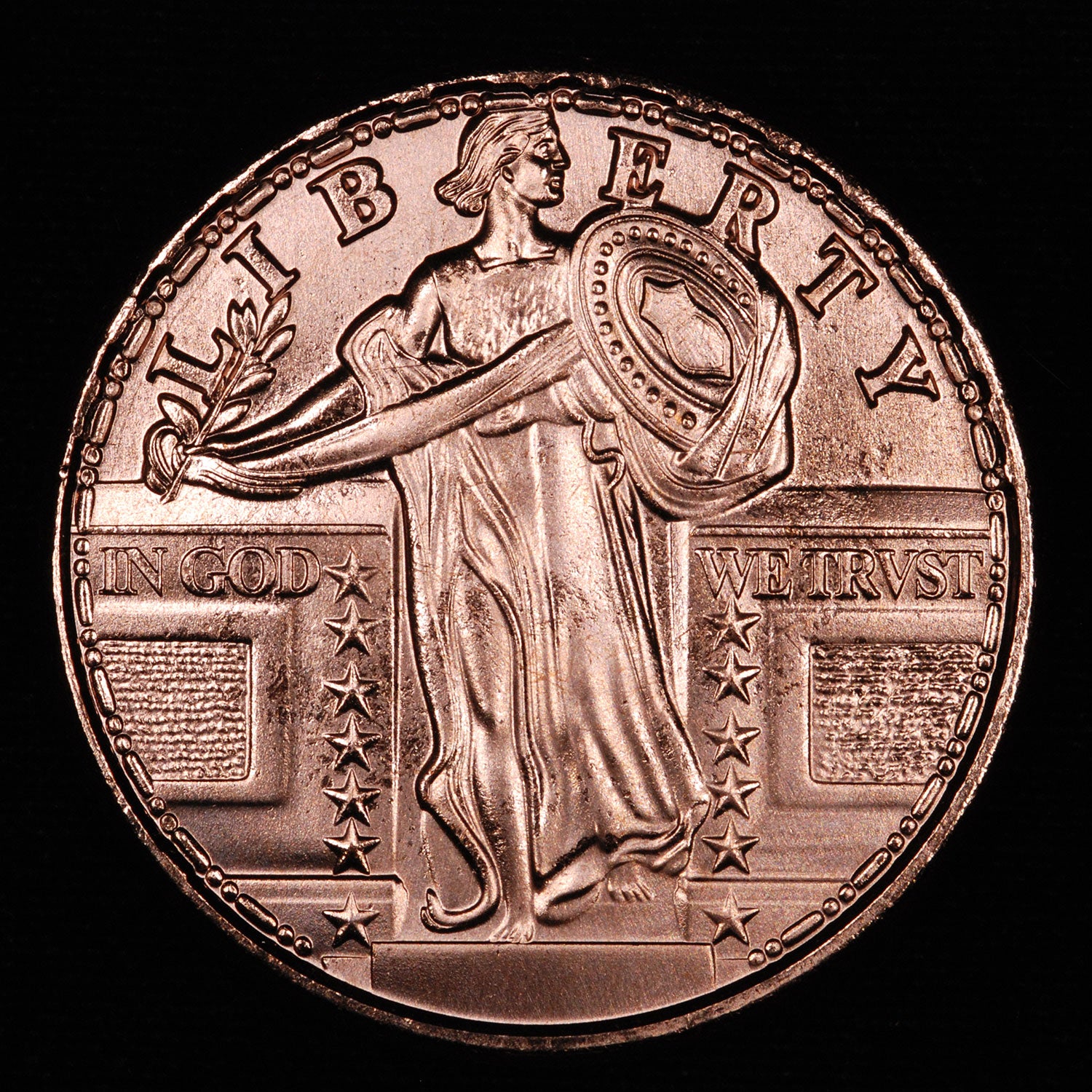 The Standing Liberty design is a beautiful allegorical peace theme designed by Hermon Atkins MacNeil in 1916 near the end of World War I. This round shows homage to this design intricately struck onto a one avoirdupois ounce copper round measuring 39mm in diameter. Copper is fast becoming one of the more valuable metals in manufacturing and industry and these gorgeous and meaningful rounds are a great way to stockpile some of this important metal!